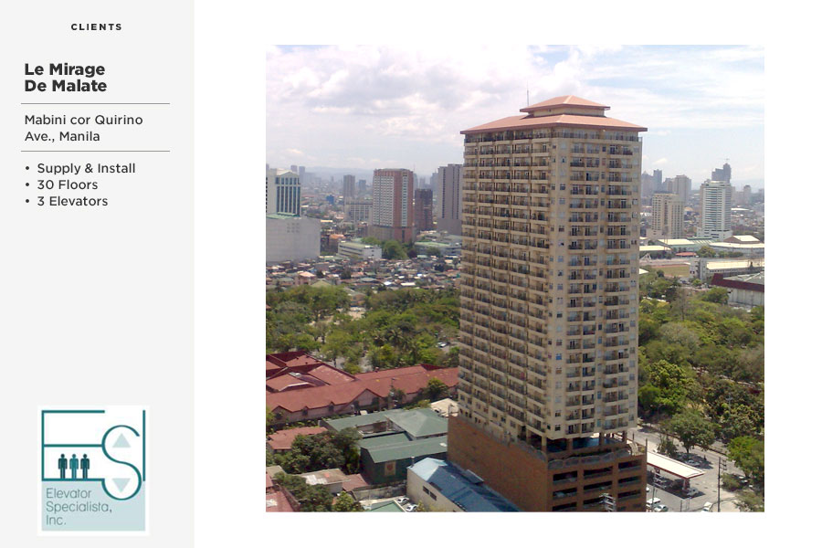 Our first elevator installation in the Philppines was last May 2004 at one of most successful development in Manila, Le Mirage De Malate developed by Builders 2000, a high-rise 30-Storey residential condominium. Three (3) units were installed and have been operating continuously and trouble-free until this time. Thus, proving our elevators are indeed reliable, durable, and good quality.
